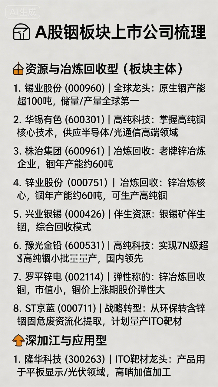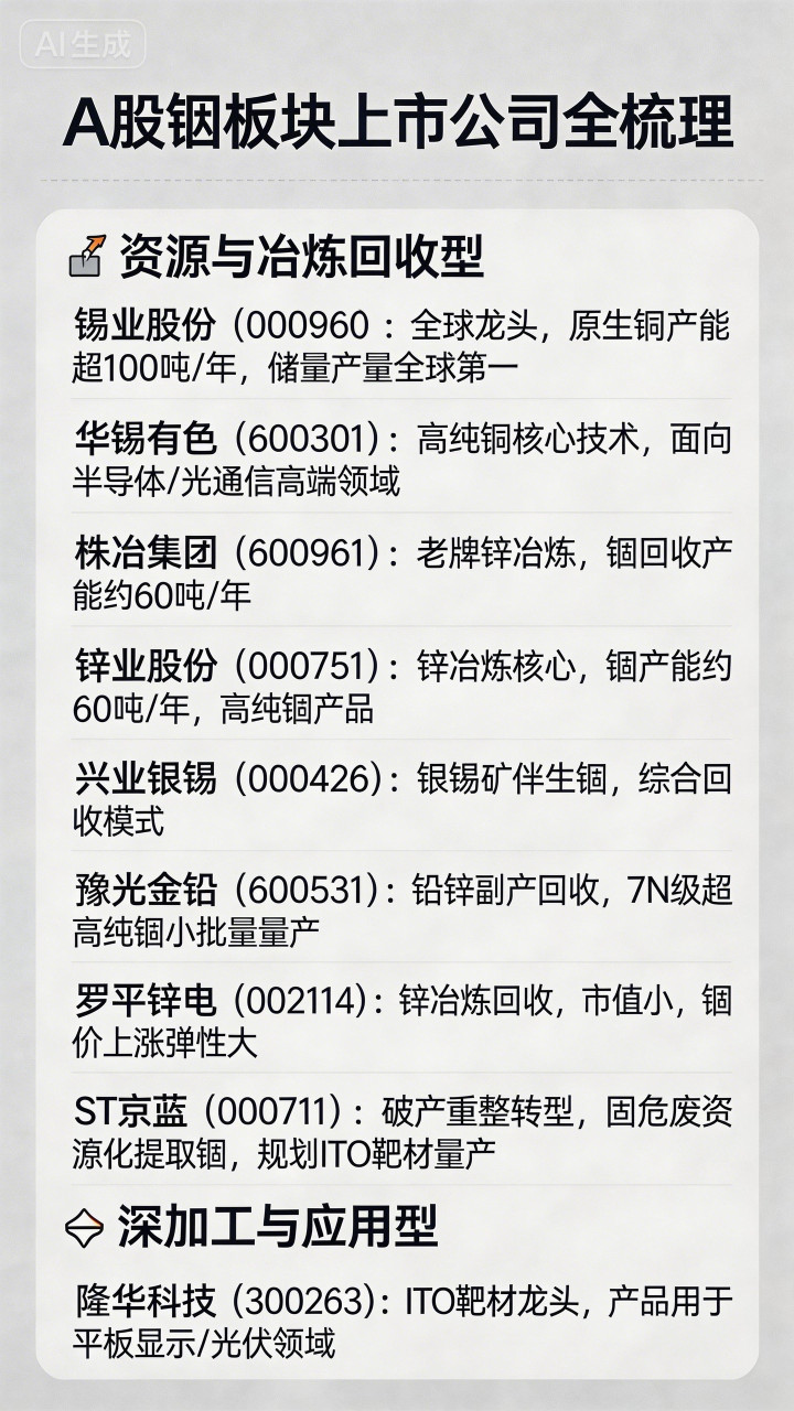 * 锡业股份 (000960):绝对龙头。公司铟资源储量和产量均居全球第一,拥有年产超100吨的原生铟产能,是全国最大的原生铟生产基地。