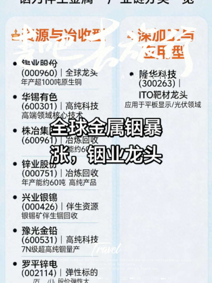 * 罗平锌电 (002114):弹性标的。公司从锌冶炼中回收铟,市值相对较小,在铟价上涨周期中股价弹性较大。