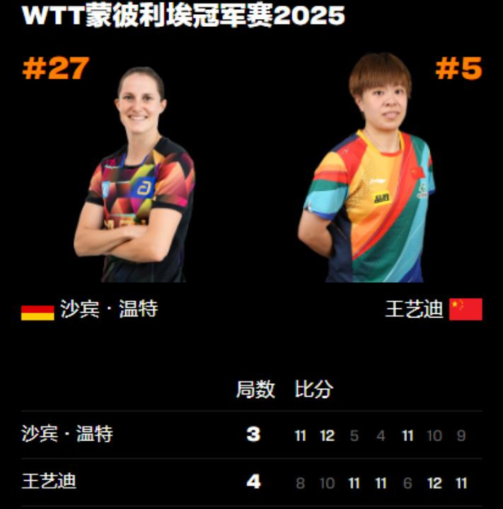 2025年11月2日晚间开打的,蒙彼利埃冠军赛女单冠军,世界第五王艺迪VS德国一姐温特。当时台下众多观众都为温特大声呐喊加油,在如此热烈为温特鼓励呐喊的情况下,王艺迪不畏强敌的一鼓作气战胜温特。